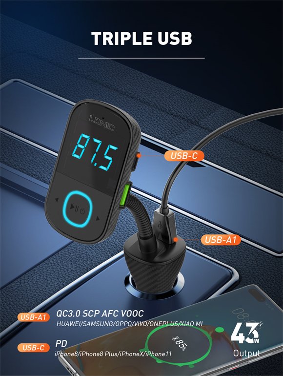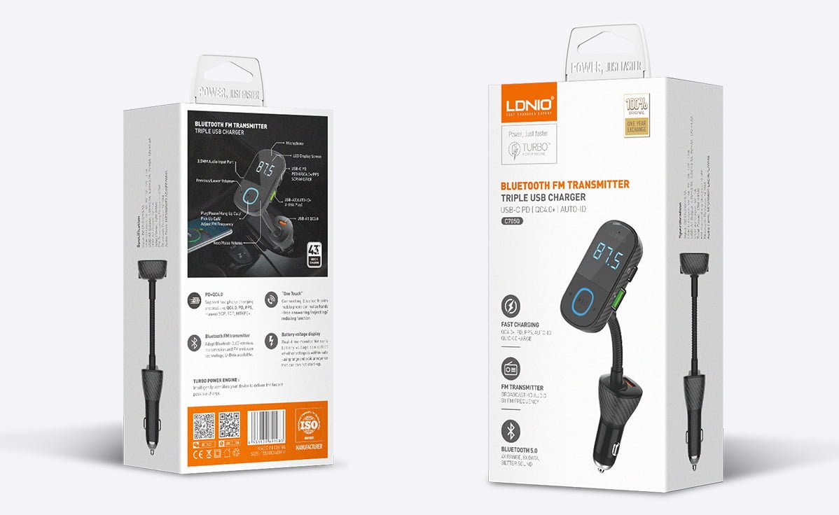 El LDNIO C705Q combina múltiples funciones en un solo accesorio para el automóvil: cargador rápido, transmisor FM y manos libres. Equipado con Bluetooth 5.0, ofrece una conexión más estable y eficiente que versiones anteriores, lo que mejora la calidad del audio y la respuesta en llamadas.
