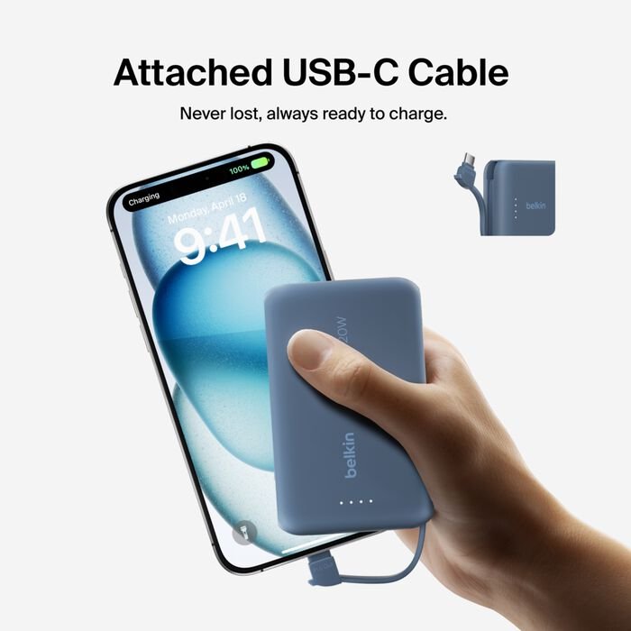 Cable USB-C integrado (≈ 5,7 cm) para cargar de inmediato sin tener que llevar cable aparte.